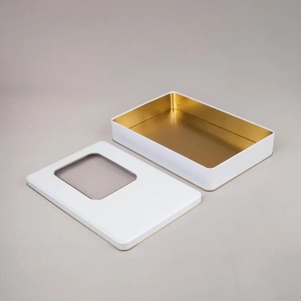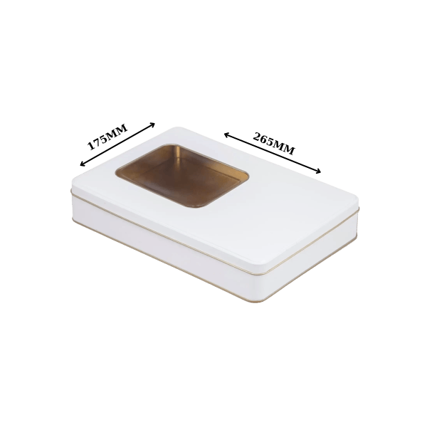 265x175x45 mm ölçülerindeki bu pencereli teneke kutu; geniş iç hacmi, gold laklı iç kaplaması ve zarif beyaz dış yüzeyiyle hem estetik hem de fonksiyonel bir ambalaj çözümüdür. Baskılı ya da baskısız seçenekleriyle markanıza özel üretim yapılabilir.