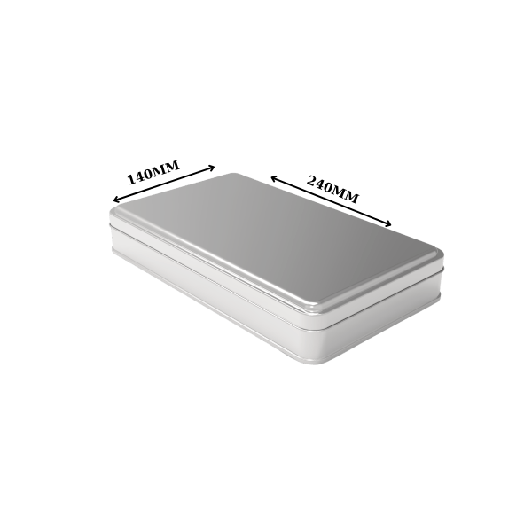 240x140x40 mm ölçülerindeki bu penceresiz teneke kutu; geniş iç hacmi, gold laklı iç kaplaması ve zarif beyaz dış yüzeyiyle hem şık hem de fonksiyonel bir ambalaj çözümüdür. Baskılı veya baskısız seçeneklerle markanıza özel üretim yapılabilir.